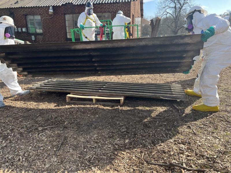 IMG_5614.JPEG<br />Date Taken: 1/13/2023<br />Category: 20230113<br />Latitude: 32.6878777777778<br />Longitude: -96.7691027777778<br />Tags: Public The EPA team beginning to remove transite roof panels from the eastern side of the roof of the electroplating room. 20230113 1/13/2023 Public